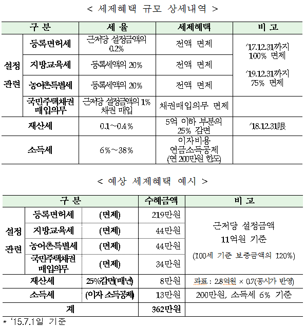 주택연금 가입시 등록면허세, 지방교육세, 농어촌특별세 면제, 제산세 감면(본세의 25%), 대출이자비용 소득공제 등 세제혜택을 받을 수 있다.