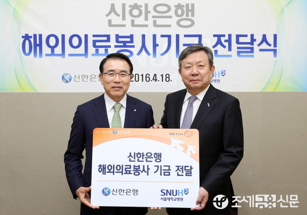(조세금융신문=김사선 기자) 신한은행은 18일 오후 5시 서울 종로구 연건동에 위치한 서울대학교병원에서 조용병 은행장과 오병희 서울대학교병원장이 참석한 가운데 미얀마 의료인력 초청연수와 해외의료봉사를 위한 후원금 전달식을 가졌다고 밝혔다.