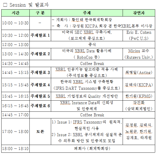 ‘이번 컨퍼런스는 XBRL 글로벌 트렌드, XBRL Data 사용 현황, XBRL Data 미래 잠재적 활용 가치 등 ‘Big Data, AI & XBRL 등을 주제로 열린다. ▲미국의 SEC XBRL 구축사례(Eric E. Cohen, PwC U.S) ▲미국의 XBRL Data 활용사례(Miclos 교수, Rutgers Univ.) 등 국내외 회계 전문가의 주제 발표가 있으며, XBRL 국내 적용에 관한 패널 토론도 진행될 예정이다.