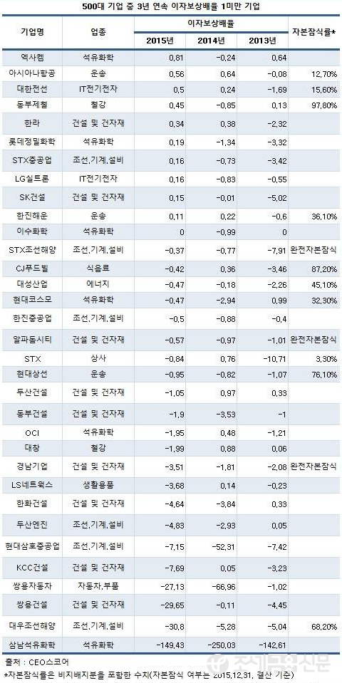 이자보상배율이 가장 낮은 기업은 삼양그룹 소속인 삼남석유화학으로, 2015년 기준 이자보상배율이 -149.43에 달했다. 이어 대우조선해양 -30.80, 쌍용건설 -29.65, 쌍용자동차 -27.13 등의 순이었다. 이들 외에도 KCC건설(-7.69), 현대삼호중공업(-7.15), 두산엔진(-4.83), 한화건설(-4.64), LS네트웍스(-3.68), 경남기업(-3.51) 등 33개 기업 가운데 22개 기업이 지난해 이자보상배율 마이너스를 기록했다.