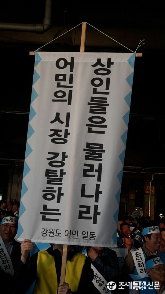 반면 궐기대회를 지켜보던 구 시장의 한 상인은 “오늘 모인 사람들 중에는 어업과는 상관없는 젊은 청년들도 많다”며 “수협이 사람을 사서 대규모 궐기대회를 열어 ‘전국 어민’의 뜻인 양 거짓을 꾀하고 있다”고 분노했다.