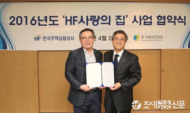 (조세금융신문=김사선 기자) 주택금융공사(HF,사장 김재천)는 사단법인 주거복지연대(이사장 남상오)와 2016년 ‘HF사랑의 집’ 사업협약을 체결했다고 22일 밝혔다.