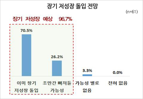 전국경제인연합회가 경제전문가 61명을 대상으로 ‘우리경제 현주소 평가 및 대책’을 조사한 결과, 10명 중 7명은 이미 장기 저성장에 돌입했다고 답했다. “조만간 빠져들 가능성”까지 포함하면 장기 저성장을 전망하는 전문가가 96.7%에 달한다.