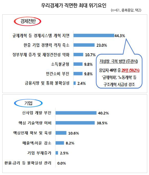 전문가들은 우리경제가 직면한 최대의 위기(중복응답)로 44.3%가 ‘경제시스템 개혁 지연’을 꼽았다. 규제철폐, 노동개혁 등이 미뤄짐에 따라 경제 전반적으로 효율성이 낮아지고 경제활력이 떨어진다는 의미로 풀이된다.
