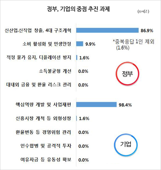 전문가들은 우리경제가 경제체력을 제고하고 저성장을 극복하려면, 정부는 ‘신산업·신직업 창출 및 구조개혁’(86.9%), 기업은 ‘핵심역량 개발 및 사업재편’(98.4%)에 중점을 두어야 한다고 답했다.
