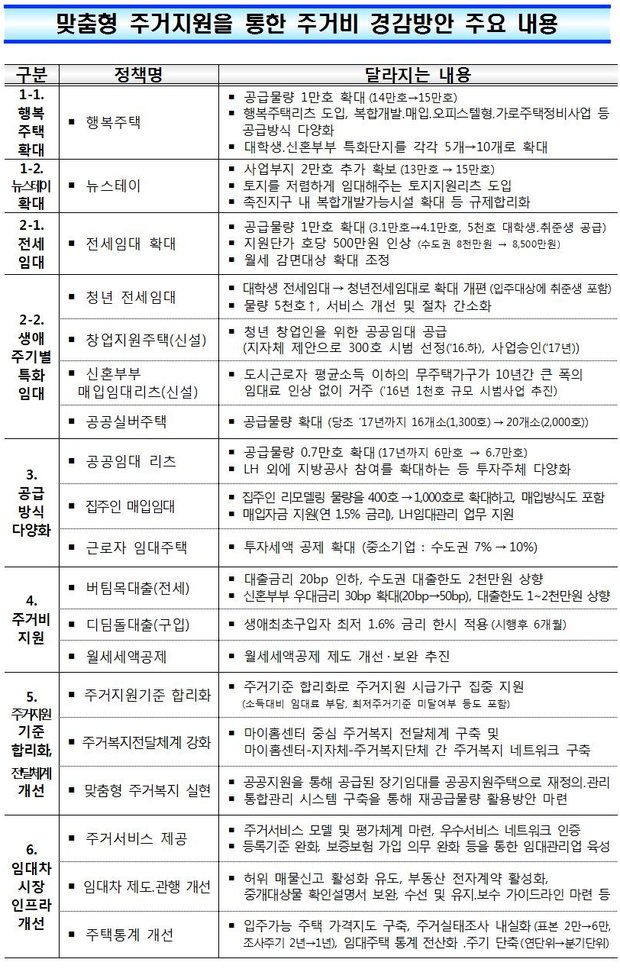 또한, 임대료 부담·최저주거기준 미달 여부를 공공임대 입주자 선정 기준에 포함할 계획으로, 변경된 기준을 적용해 연내 전세임대 대상자 선정을 추진하고 내년 매입·전세임대, 2018년 영구·국민임대로 단계적으로 확대할 계획이다.