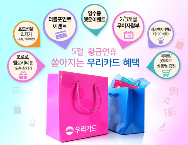 우리카드 관계자는 “다음달 6일 임시공휴일 지정에 따른 가정의 달 황금연휴기간을 우리카드 고객들이 알뜰하게 즐길 수 있도록 마련”했다며 “부모님과 자녀의 선물 구입 및 가족 나들이 길에 고객들의 부담을 덜어줄 수 있을 것”이라고 말했다.