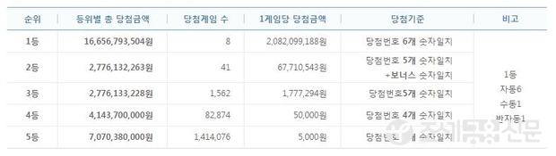 당첨번호 5개를 맞힌 3등은 1,562명으로 각각 177만원씩 받는다. 당첨번호 4개를 맞힌 4등(고정 당첨금 5만원)은 8만2,874명, 당첨번호 3개가 일치한 5등(고정 당첨금 5,000원)은 141만4,076명이다.