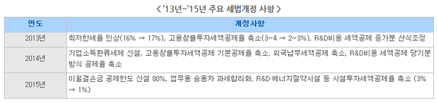 2009년 14%였던 최저한세율은 두 차례 인상을 거쳐 17%가 되었고, 임시투자세액공제와 고용창출투자세액공제 기본공제는 아예 폐지되었다.