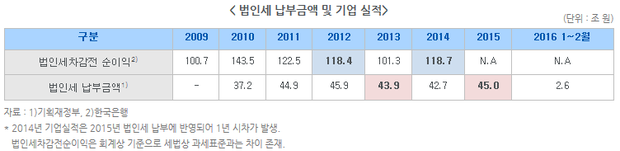 실제로 기업들이 납부한 법인세 규모도 증가하였다. 기획재정부에 따르면, 2015년 법인세 납부액은 45조 원으로 전년보다 2조3000억 원 늘었다. 올해 1~2월 법인세 납부실적도 전년 같은 기간보다 53% 증가한 2조6000억 원이었으며, 세수목표 대비 납부실적인 법인세 수입 진도율*은 5.7%로 전년동기보다 1.7%p 증가하였다.