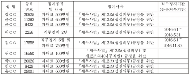 한편 이번에 직무정지 처분을 받은 징계 대상 세무사들은 내달 1일부터 자격이 정지된다.