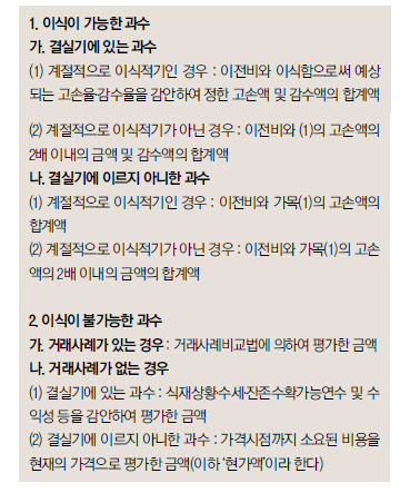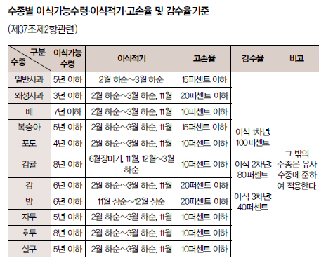 지장물인 과수에 대하여는 다음 각호의 구분에 따라 평가한다. 이 경우 이식가능성·이식적기·고손율(枯損率) 및 감수율(減收率)에 관하여는 법 시행규칙 별표2의 기준을 참작하여야 한다.