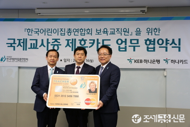 (조세금융신문=김사선 기자) 하나카드(대표이사 정수진)는 16일 한국어린이집총연합회(회장 정광진) 및 KEB하나은행과 한국어린이집총연합회 보육교직원을 위한 ‘국제교사증 제휴카드’ 업무 협약을 체결했다고 밝혔다.