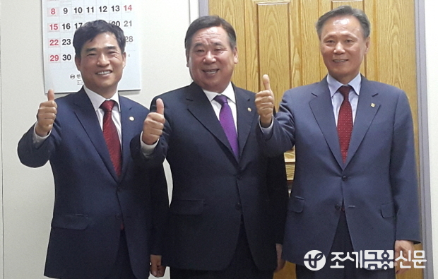 (조세금융신문=나홍선 기자) 제12대 서울지방세무사회 임원선거에 회장 후보로 나선 임채룡 세무사(가운데)가 부회장 후보인 정해욱(왼쪽)·이헌진(오른쪽) 세무사와 함께 자신들의 기호인 1번을 의미하기 위해 엄지를 들어 보이고 있다.