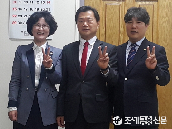 (조세금융신문=나홍선 기자) 제12대 서울지방세무사회 임원선거에 회장 후보로 나선 이종탁 세무사(가운데)가 함께 부회장 후보로 나선 김겸순(왼쪽)·윤정기(오른쪽) 세무사와 자신들의 기호인 2번을 의미하기 위해 손가락으로 승리의 브이 자를 만들어 보이고 있다.