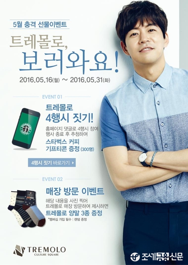 한편, 트레몰로는 홈페이지에 댓글로 트레몰로 4행시를 작성하는 고객 300명에게 스타벅스 기프티콘를 증정하는 ‘4행시 이벤트’ 및 매장 내 비치된 이벤트 포스터를 촬영하여 방문 시 양말 3종을 증정하는 이벤트를 이달 말까지 진행한다. 트레몰로의 쿨링 시리즈 및 이벤트에 관한 자세한 내용은 전국 이마트, 홈플러스, 롯데마트, 뉴코아, 세이브존 등의 유통매장에 입점한 220개의 트레몰로 매장과 공식 홈페이지(www.tremolo.co.kr)에서 확인 가능하다.