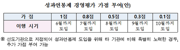 행정자치부(장관 홍윤식)는 31일 6월말까지 성과연봉제 도입을 완료하면 가점 1점을 부여하고, 월별로 가점을 차등 적용하며, 연내 미도입 기관에 대해선 3점을 감점할 계획이라고 밝혔다. 이 경우, 조기 도입 기관과 미도입 기관 간에 최대 4점의 격차가 나게 되며, 경영평가 등급 자체가 달라질 수 있다.