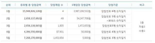당첨번호 5개를 맞힌 3등은 1,805명으로 각각 147만원씩 받는다. 당첨번호 4개를 맞힌 4등(고정 당첨금 5만원)은 8만7,931명, 당첨번호 3개가 일치한 5등(고정 당첨금 5,000원)은 145만3,654명이다.