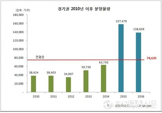 건설부동산업계와 포털 닥터아파트(www.DrApt.com)에 따르면 2010~2016년 경기도 연평균 아파트 분양물량은 7만4,620가구다. 하지만 2015년 분양물량은 15만7,479구에 달해 111% 많았다. 또 2016년에도 13만8,659가구로 86% 늘어날 전망이다.