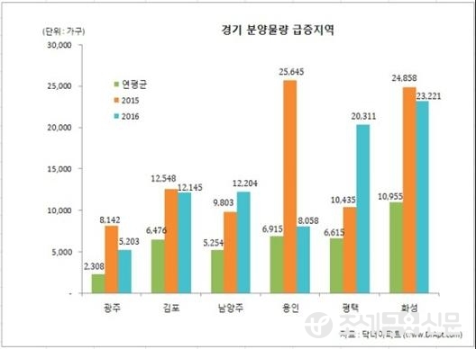 2015~16년 분양물량이 급증한 경기 지역(연평균 분양물량 1,000가구 이상)을 보면 화성이 단연 눈에 띈다. 2010년 이후 연평균 분양물량이 1만955가구에 달하는데 2015년 2만4,858가구, 2016년 2만3,221가구로 각각 211%, 186% 증가했다.