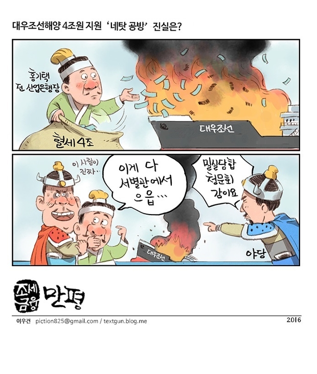 [조세금융 만평]대우조선해양 4조원 지원 '네탓 공방' 진실은?