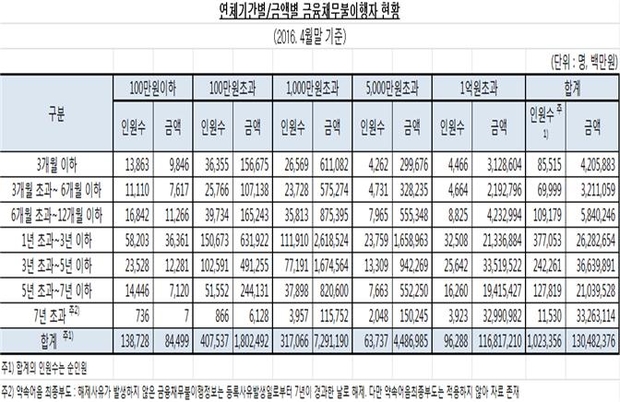민병두 의원(더불어민주당, 동대문을)이 한국신용정보원에서 제출한 “연체기간/금액별 금융채무불이자 현황”을 분석한 결과, 2016년 4월말 기준으로 금융채무불이행자는 102만명, 연체금액은 130조원에 달했다.