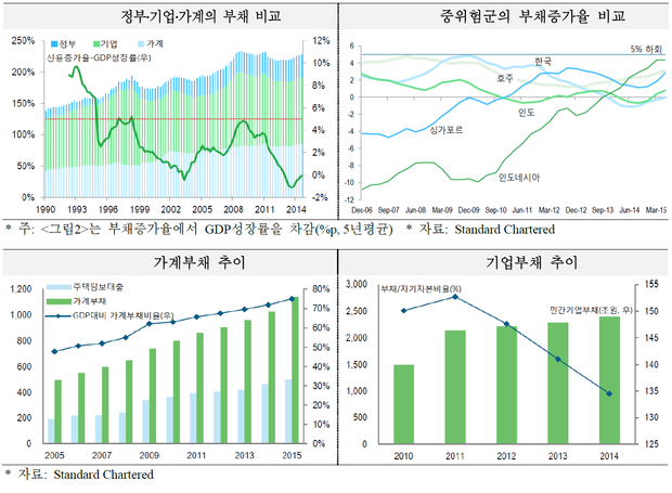 기업부채와 관련해서는 대외경기 부진에 따른 영업이익 감소가 불안요인이나 향후 구조조정 등이 수익성 제고와 리스크 축소 등에 기여할 전망이다. 기업부채 증가율은 2011년 이후 5%를 하회하고 자기자본대비 부채비율도 하락세를 유지하고 있다,.