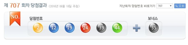 (조세금융신문=하지연 기자) 나눔로또가 제707회 로또당첨번호를 18일 발표했다. 로또 707회 1등 당첨번호는 '2, 12, 19, 24, 39, 44'이다. 2등인 보너스 번호는 '35'이다.
