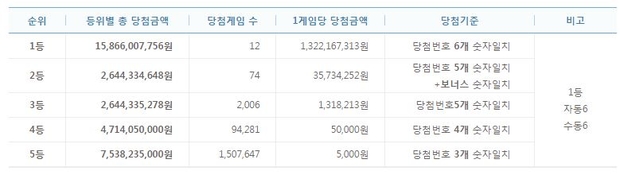 당첨번호 5개를 맞힌 3등은 2,006명으로 각각 131만원씩 받는다. 당첨번호 4개를 맞힌 4등(고정 당첨금 5만원)은 9만4,281명, 당첨번호 3개가 일치한 5등(고정 당첨금 5,000원)은 150만7,647명이다.