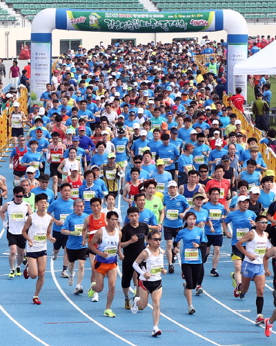 19일 오전 김해운동장에서 진행된 BNK경남은행과 함께하는 2016김해숲길마라톤 대회에는 손교덕 은행장과 김해시 허성곤 시장을 비롯해 지역민과 마라톤 동호인 등 2000여명이 참가했다.