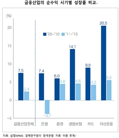보고서에 따르면, 금융산업이 경제에서 차지하는 비중은 1953년 0.4%에서 2016년 6.5%까지 확대됐지만 글로벌 경제의 저성장 국면이 지속되고, 초저금리 시대가 도래하면서 금융산업의 수익성과 성장성이 둔화되고 있는 모습을 나타냈다. 국내은행의 부실채권 규모가 증가하고 부실채권 비율이 상승하고 있으며, 2013년 이래로 금융산업 내 인력 구조조정도 지속되고 있다.