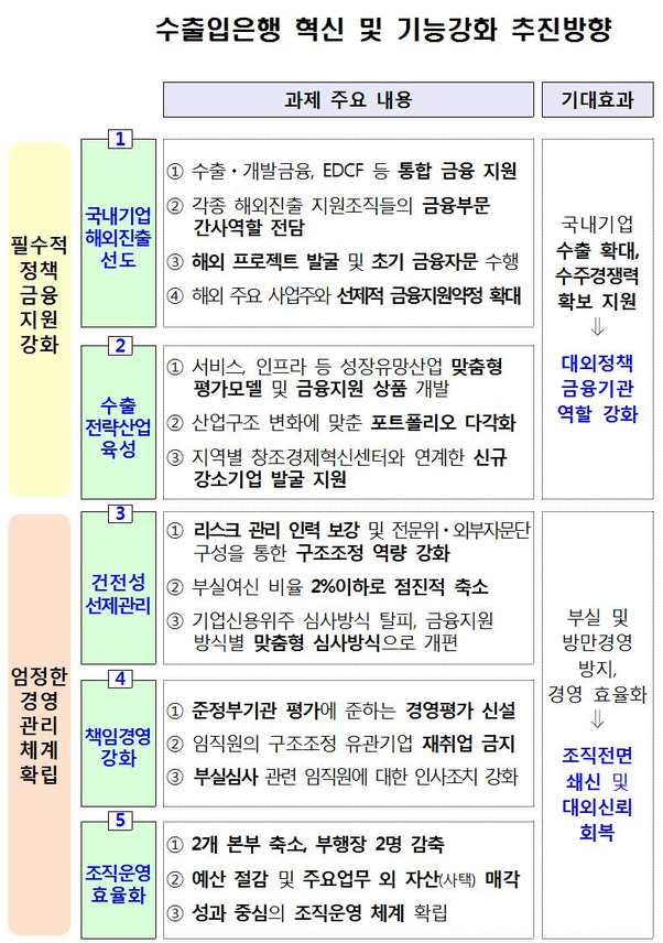 수은이 이날 발표한 혁신방향은 크게 ‘필수적인 정책금융 지원강화’와 ‘엄정한 경영관리 체계 확립’ 등 2대 부문으로 나뉘며, 세부적으로 ▲국내기업 해외진출 선도 ▲수출 전략산업 육성 ▲건전성 선제관리 ▲책임경영 강화 ▲조직운영 효율화 등 5개 추진과제를 실행할 방침이다.