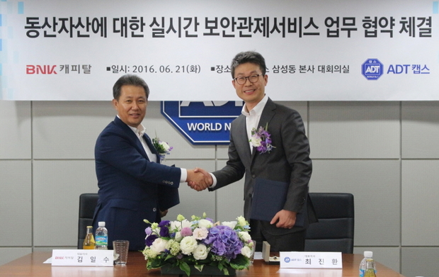 (조세금융신문=김사선 기자) BNK캐피탈(대표 김일수)이 보안 전문기업인 ADT캡스(대표 최진환)와 업계최초로 ‘동산자산 보안관제 시스템 구축’ 업무협약을 21일 ADT캡스 본사(서울 삼성동 소재)에서 체결했다고 밝혔다.