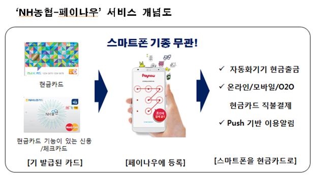 NH농협은행 및 농·축협 현금카드를 발급받은 농협계좌 보유고객은 스마트폰 기종에 관계없이 ‘페이나우’에 현금카드를 등록하고 전국 2만 6천여 NH농협 자동화기기에서 현금을 출금할 수 있으며, 11만 여개의 페이나우 가맹점에서 현금카드로 온라인 결제가 가능해진다.