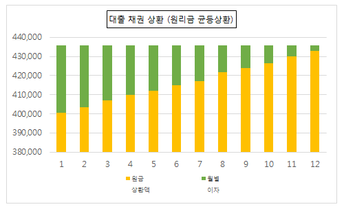 대출자의 매달 월 상환금은 435,884원으로 동일하지만, 매달 상환금에서 원금이 차지하는 비중이 다르다. 즉, 첫 달 갚은 원금을 제외한 금액에서 둘째 달 이자가 계산되기 때문에 갈수록 원금이 차지하는 비중이 늘고, 이자가 차지하는 비중은 줄고 있는 것이다.