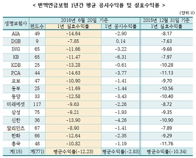 금소연의 자료에 따르면 2016년 6월 20일 기준 직전 1년간 운용된 변액보험 투입펀드의 실효수익률이 모든 조사대상 생명보험사의 지난 1년간 평균 수익률이 마이너스였으며, 최대 –14.64(AIA)부터 최소 -7.65%(DGB)로 납입보험료대비 손실 폭이 매우 큰 것으로 분석됐다.