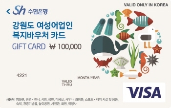 강원도 여성어업인 복지바우처 카드는 지원대상으로 선정된 여성 어업인들이 문화·스포츠·여행 등 총 15개 업종에서 연간 10만원까지 사용할 수 있는 기프트카드이다.