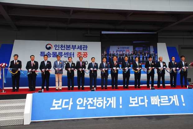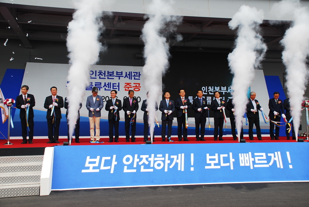 (조세금융신문=김사선 기자) 관세청이 30일 개최한 인천공항 ‘특송물류센터’ 준공식에서 천홍욱 관세청장과 외빈들이 테이프커팅을 하고 있다.