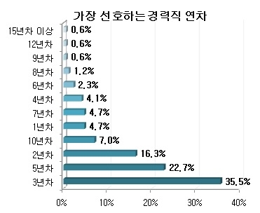 4일 사람인이 172개 기업을 대상으로 조사한 결과에 따르면, 선호하는 경력직 연차는 ‘3년차’(35.5%)라는 응답이 가장 많았다. 다음으로 ‘5년차’(22.7%), ‘2년차’(16.3%), ‘10년차’(7%), ‘1년차’(4.7%), ‘7년차’(4.7%), ‘4년차’(4.1%) 등의 순으로 평균 4.2년인 것으로 집계됐다.