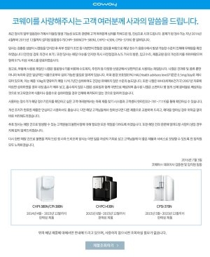 앞서 한 매체는 코웨이가 지난해 7월부터 일부 얼음정수기 제품에서 니켈 등 중금속이 검출된다는 사실을 인지하고도 소비자에게 이를 숨기고 1년 전부터 개선 작업을 벌여왔다고 보도했다. 문제가 된 제품은 CHPI-380N(CPI-380N), CHPCI-430N, CPSI-370N 등이었다.