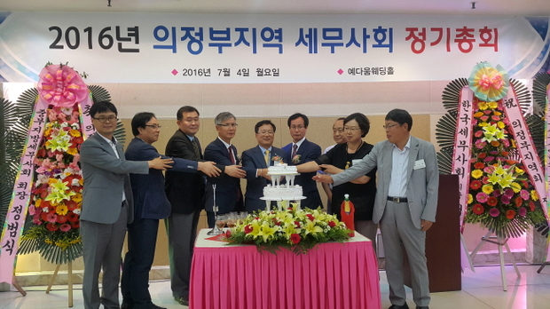 (조세금융신문=나홍선 기자) 4일 개최된 의정부지역 세무사회 정기총회에서 이금주 회장과 정범식 중부지방세무사회장, 김용관 의정부세무서장 등 내외빈들이 축하 케이크를 절단하고 있다.