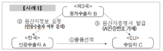 가장 많이 확인된 부적정 발급 유형은 A사의 사례와 같이 제3국 중계수출자가 우리나라 수출자의 인증수출자번호를 임의로 기재하여 원산지증명서를 발급한 것이었다.(사례1)