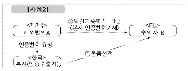 또한 국내기업의 제3국 소재 해외법인이 본사의 인증수출자 번호로 원산지증명서를 발급한 사례(사례2)도 다수 확인되었다.