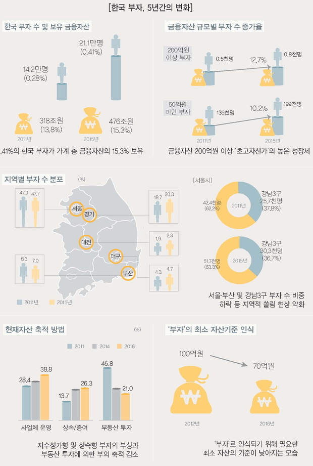 KB금융지주 경영연구소가 6일 발표한 ‘2016 한국부자보고서’에 따르면 한국 부자 수는 2011 년 14만2천명에서 1만1천명으로 늘었으며 금융자산은 318조원에서 476조원 증가했다.