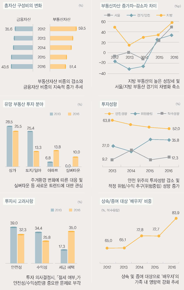 한국부자들의 총자산은 금융자산 43.6%, 부동산자산 51.4%, 기타자산 5.0%로 구성됐으며, 2012 년 이후 부동산자산 비중은 하락세를 보인 반면 금융자산 비중은 상승세를 보였다.