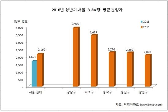 건설부동산업계와 닥터아파트에 따르면 2016년 상반기(1~6월) 서울에서 분양한 아파트 분양가는 3.3㎡당 평균 2,160만원을 기록했다.