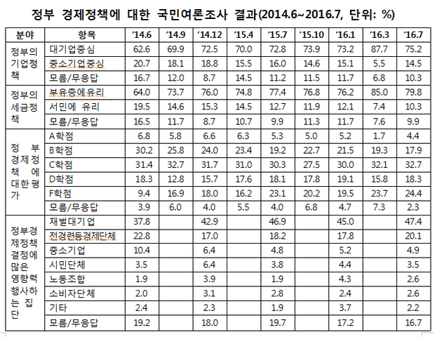 정부 기업정책에 대해서는 “대기업 중심”이라는 응답은 75.2%, “중소기업 중심”이라는 응답은 14.5%로 나타났다. 3개월 전(2016.3)에 비해 “대기업 중심”은 12.5%p 낮아졌고, “중소기업 중심”은 9.0%p높아 졌다.