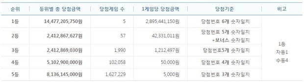 당첨번호 5개를 맞힌 3등은 1,990명으로 각각 121만원씩 받는다. 당첨번호 4개를 맞힌 4등(고정 당첨금 5만원)은 10만2,058명, 당첨번호 3개가 일치한 5등(고정 당첨금 5,000원)은 162만7,229명이다.