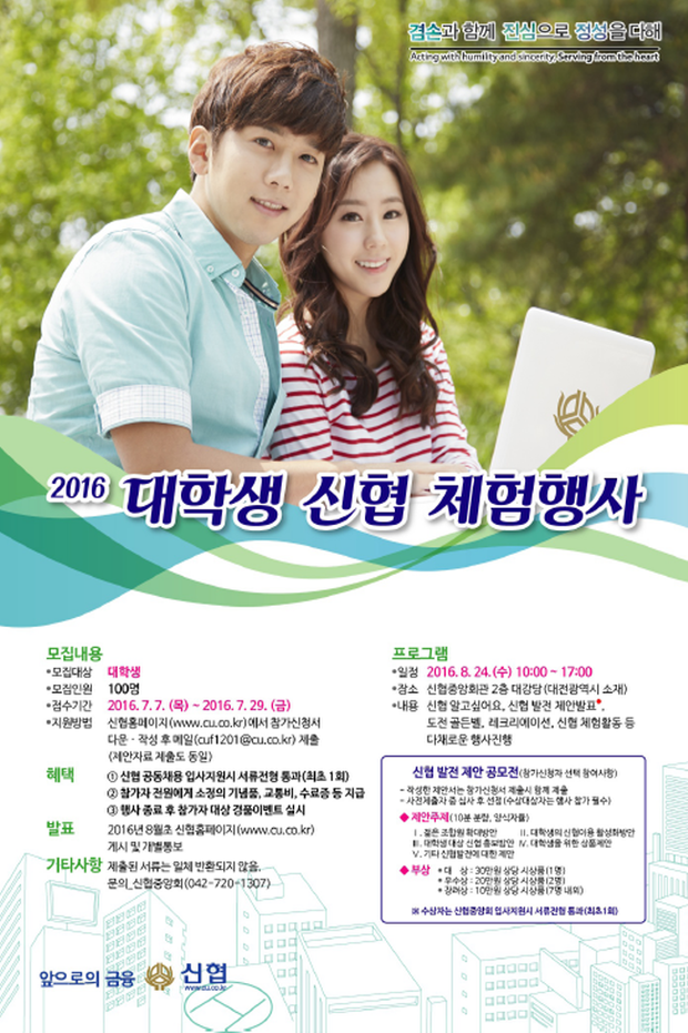 참가자격은 국내외 소재하는 대학에 재학중인 대학생(전공무관)으로 참가신청서를 통해 누구나 지원이 가능하다. 참가신청은 신협 홈페이지(www.cu.co.kr)에서 신청서를 내려받아 이달 29일까지 행사담당자 이메일(cuf1201@cu.co.kr)로 제출하면 된다.