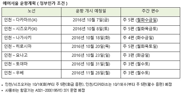 아시아나항공이 주 3편을 운항하였던 인천↔시즈오카, 인천↔다카마쓰 노선을 주 5편으로 증편하고, 인천↔나가사키, 인천↔야마구치 우베 노선을 정기편으로 신규 취항할 예정이다.